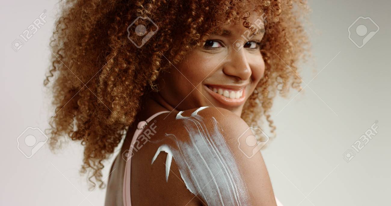 Metisse Femme Blonde Aux Cheveux Boucles Blonde En Studio Avec Une Creme Sur Sa Peau Banque D Images Et Photos Libres De Droits Image 88733446