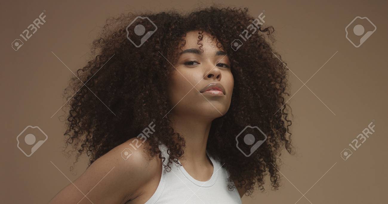 Portrait De Femme Metisse Noir Avec Grands Cheveux Afro Cheveux Boucles Sur Fond Beige Banque D Images Et Photos Libres De Droits Image 93437640